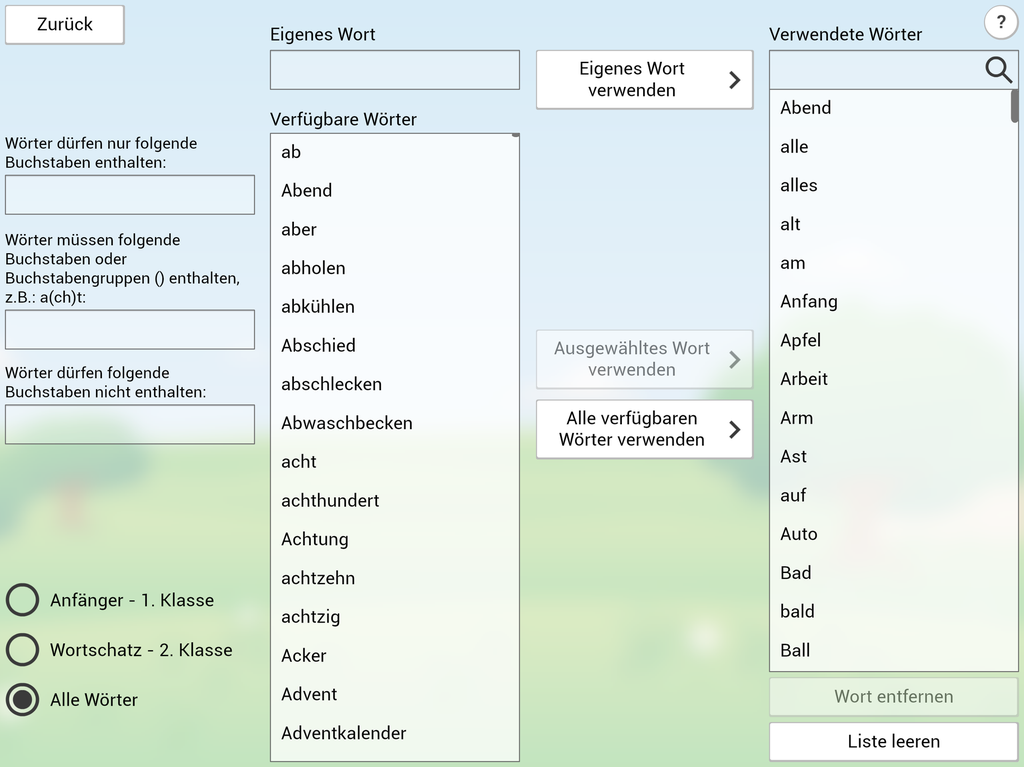Die zu übenden Wörter können flexibel eingestellt werden. Es kann aus einem vorgegebenen Wortschatz von ca. 2600 Wörtern gewählt werden. Zu diesen Wörtern gehören Sprachaufnahmen ausgebildeter Sprecher. Auch ist es möglich eigene Wörter hinzuzufügen. Für nicht vorhandene Wörter können eigene Sprachaufnahmen erstellt werden.
