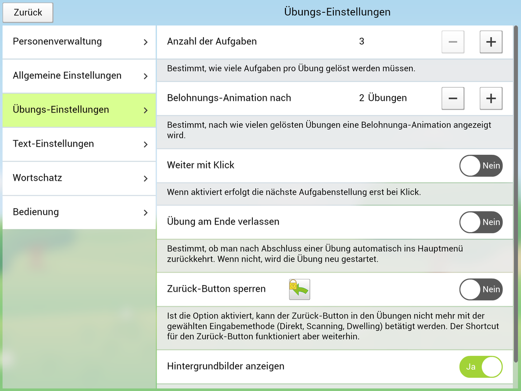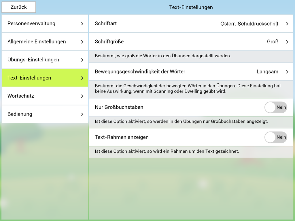 Verschiedene Einstellmöglichkeiten erlauben eine gute Anpassung an die Bedürfnisse der übenden Person. Die Aussprache der Wörter kann beispielsweise auf Deutsch oder Österreichisch eingestellt werden.