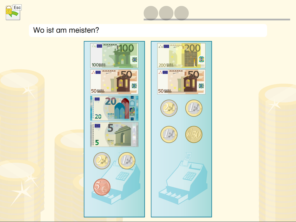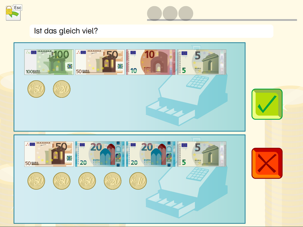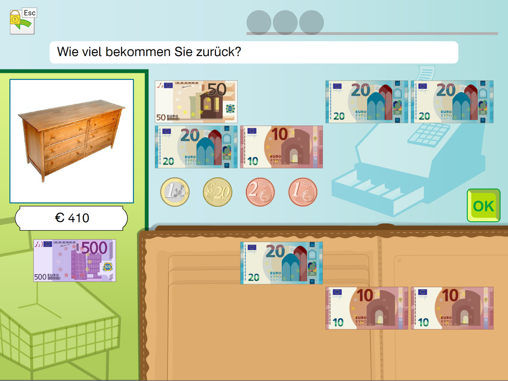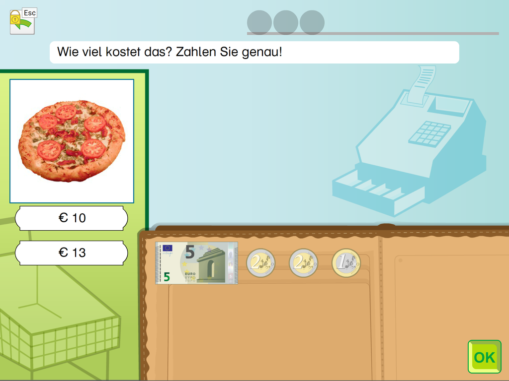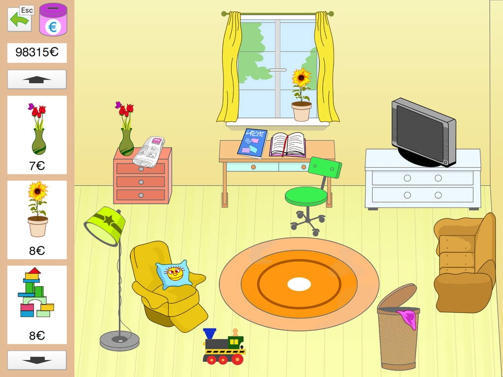 Durch das Lösen von Aufgaben erhält die übende Person virtuelles Geld, das zum Einrichten eines Zimmers verwendet werden kann. Dieses spielerische Belohnungssystem soll das Thema „Sparen“ näherbringen.