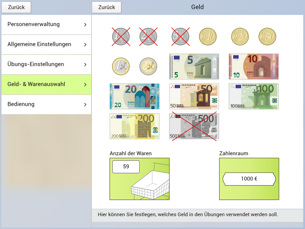 Eine Vielzahl an Einstellungsmöglichkeiten erlaubt es, die App an die Kenntnisse der übenden Person anzupassen. So kann beispielsweise bestimmt werden, welche Münzen und Geldscheine in den Übungen Verwendung finden sollen. Außerdem ist es möglich eigene Waren für die Übungen hinzuzufügen.