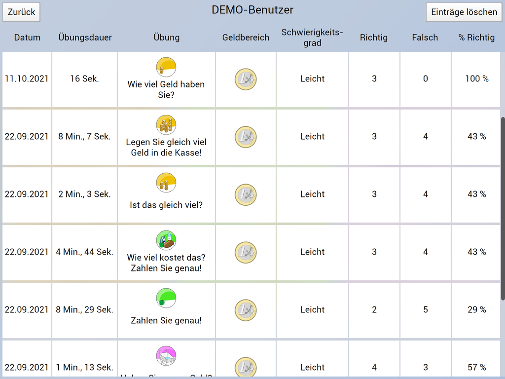 Alle abgeschlossenen Übungen werden protokolliert und so die Überprüfung des Lernfortschritts ermöglicht.