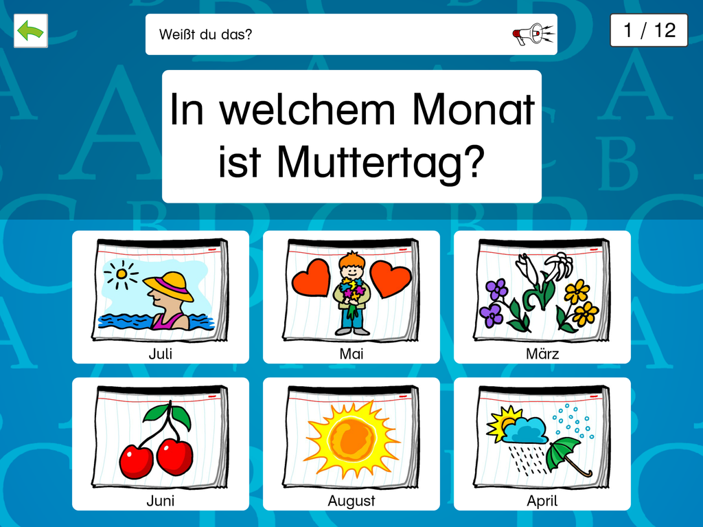 Die App enthält das Lernpaket „Jahreskreis“ mit vielen fertigen Multiple-Choice-Aufgaben in unterschiedlichen Schwierigkeitsgraden. Thema dieses Lernpakets für Kinder ist das Jahr mit seinen Monaten und Jahreszeiten. Neben einfachen visuellen Zuordnungsaufgaben finden sich im Paket spannende Hörübungen, Lese- und Schreibaufgaben, Assoziationsübungen und Wissensfragen. Das Lernpaket ist somit ein wunderbarer Begleiter durch das ganze (Schul-)Jahr.